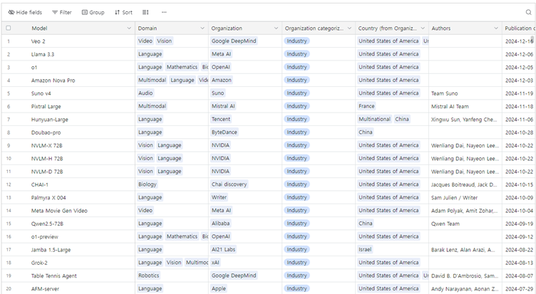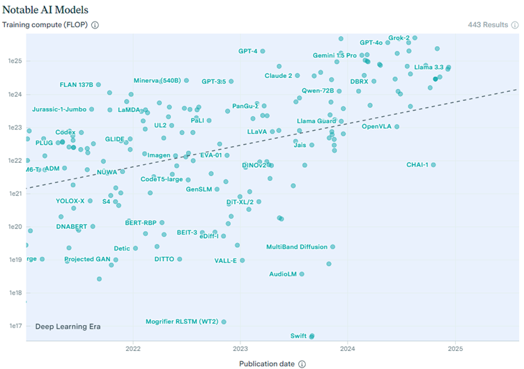 - 전 세계에서 사용되는 생성형 AI 800개 이상의 모델에 대하여 Training Compute (FLOP)을 기준으로