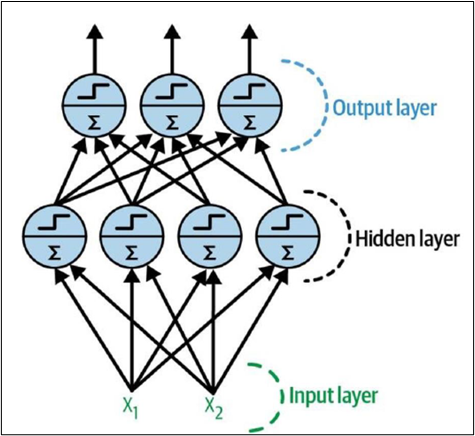 - 계층적 구조: 입력층(Input layer), 하나 이상의 은닉층(Hidden layers), 출력층(Output layer)으로 구성됩니다.