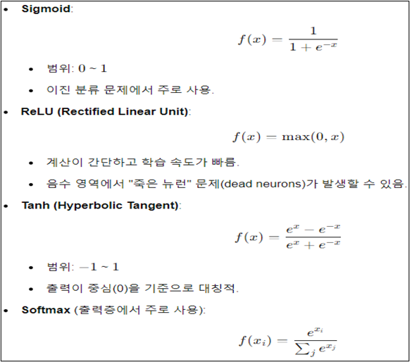 . 은닉층에서 활성화 함수는 뉴런의 출력에 비선형성을 추가합니다. 일반적으로 사용하는 함수는 다음과 같습니다.